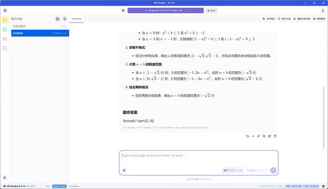 接下来,我们在LMstudio中加载Deepseek 32B模型,让两台机器计算以下数学题:“设a,bER,若当|x|≤1时,恒有|(x-a)^2+b|≤1,则a+b的取值范围是多少”