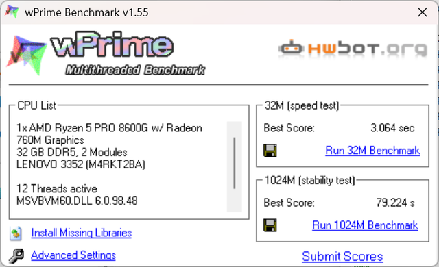 AMD 锐龙5 PRO 8600G处理器 wPrime测试结果